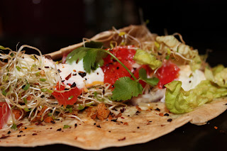 Start with the meat and top with some cheese, onions, tomato’s, lettuce, sprouts, avocado, sour cream and pepper flakes; pour 1-2 tablespoons of Tequila Lime Sauce over the top, garnish with cilantro fold in half and ENJOY!