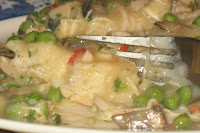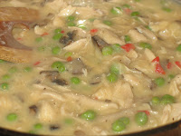 In a separate deep skillet add the oil and butter; melt together; add the onions and mushrooms cook for 5-7 minutes till tender. Add flour and cook for 1-2 minutes. Add the chicken broth mixture from the other skillet or at this time (if using rotisserie chicken) add the broth, wine and bay leaf to the skillet and simmer for 12-15 minutes. Remove the bay leaf. Mix the cornstarch into the cold milk or half and half and set aside. Stir the peas and pimentos or peppers into the mixture; add chicken and cayenne or paprika; gently stir in the milk mixture to thicken; salt and pepper to taste.