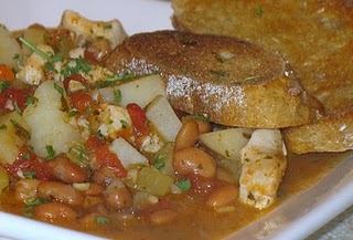 Stir in the tomatoes, chicken broth, bay leaves, basil pesto, thyme, parsley and chopped potatoes; simmer for 15-20 minutes then add chicken pieces. Continue to simmer on low to medium heat till the chicken is cooked through and tender and potatoes are soft; additional 15 -20 minutes; add the beans and continue to simmer for 8-10 minutes . The best flavor comes from a slow simmer and let the flavors come together.
