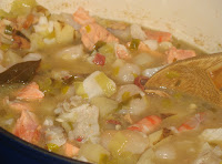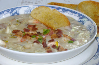 In a heavy stock pot on medium heat cook the bacon till lightly crisp; remove and reserve 4-5 tablespoon of the bacon for garnishing the chowder; add to the remaining bacon the garlic and cook for 1-2 minutes to release the flavor; add the chopped onions, leek, potatoes, clam juice; chicken broth and bay leaves; simmer on low heat for 15-20 minutes till all is tender.