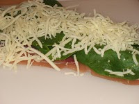 Lay out chicken breasts, salt and pepper, lay 2 slices of prosciutto on top of chicken, top with 2-3 spinach leaves; 1/4 cup cheese and the thyme leaves